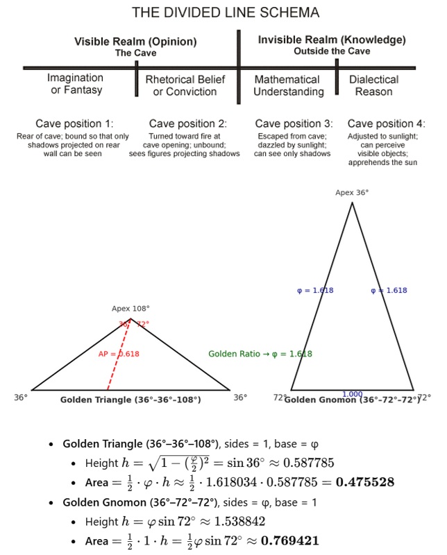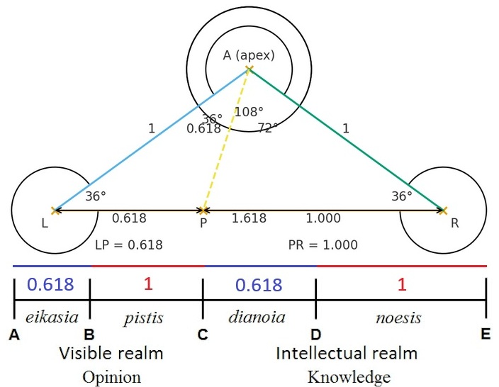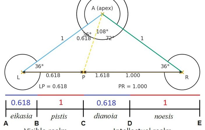 Hopefully, many people know of Plato’s allusion to people chained in a cave who can only look at the shadows on the wall in front of them. This is the reality that The Common Person on the Street recognizes, not knowing that there is a larger perspective. I had heard of The Divided Line, but never really gave it much thought beyond the fact that is another geometric display of The Golden Mean. That would be 1.618 or its reciprocal .618.