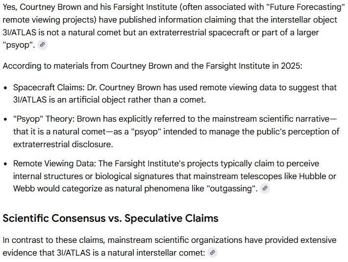 I do not subscribe to the The Future Forecasting Group or anything else connected to Courtney Brown, the Farsight Institute and their Remote Viewing claims. I just asked Google AI this question: