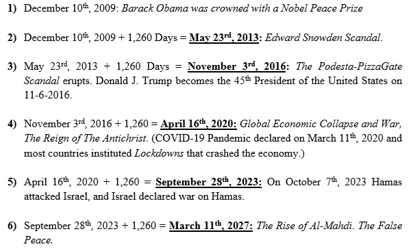 I have since come around, and I now believe that Revelation’s Two Witnesses have not shown up. But it is a funny thing regarding adding “one thousand two hundred and threescore days” successively to December 10th, 2009. Here is the chart from my book.